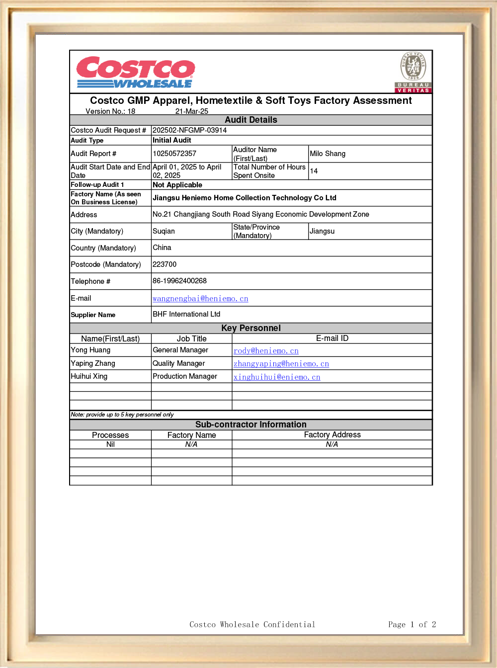 Read MoreAs results, we keep zero complains for Costco orders in the last 20 years. We believe that best quality is the key to excellence.